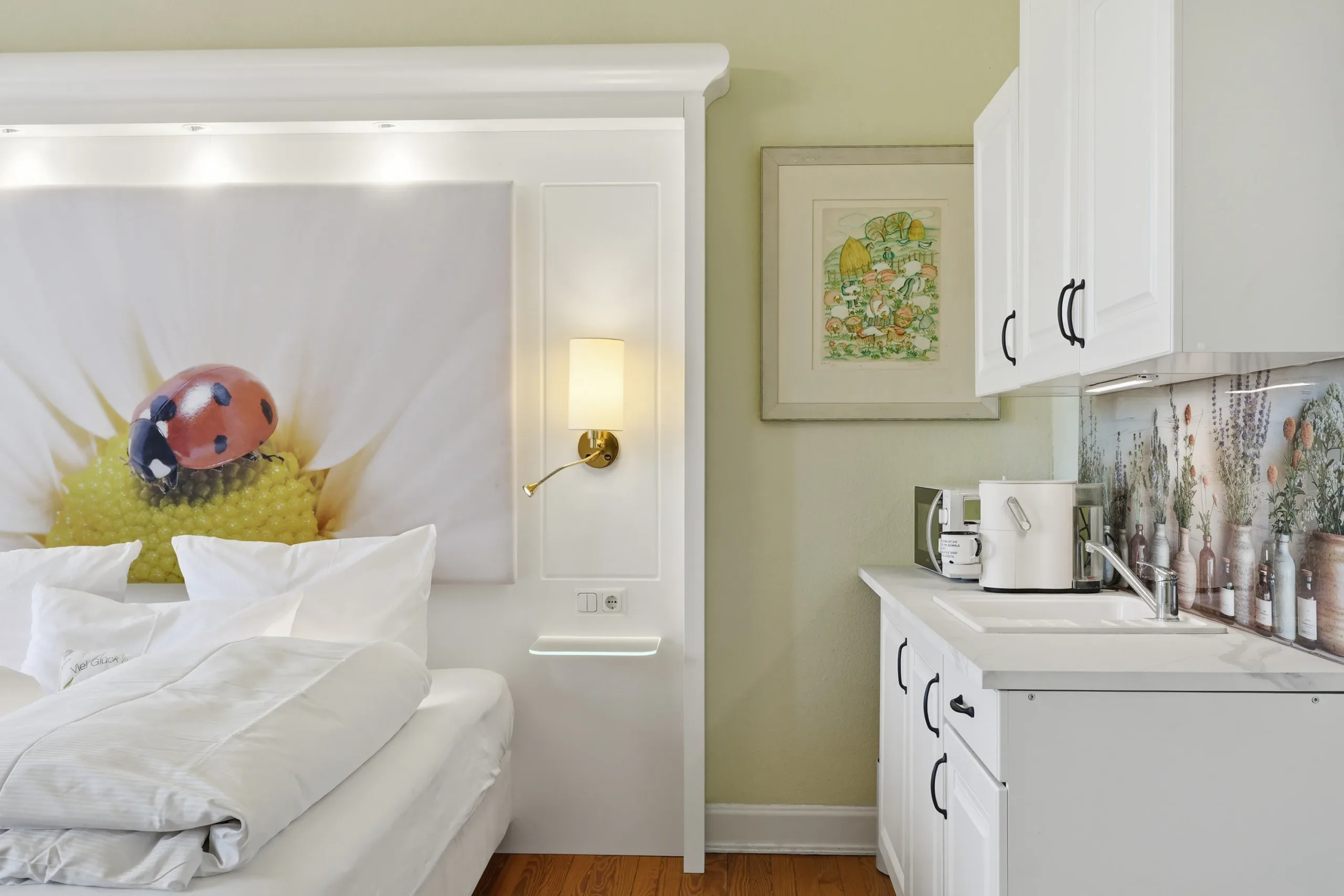 Das frische, hoffnungsvolle und zarte Grün, das Spiel mit den Symbolen des Glücks geben diesem charmanten Zimmer eine besondere Ausstrahlung, die nur eines macht: Glücklich!