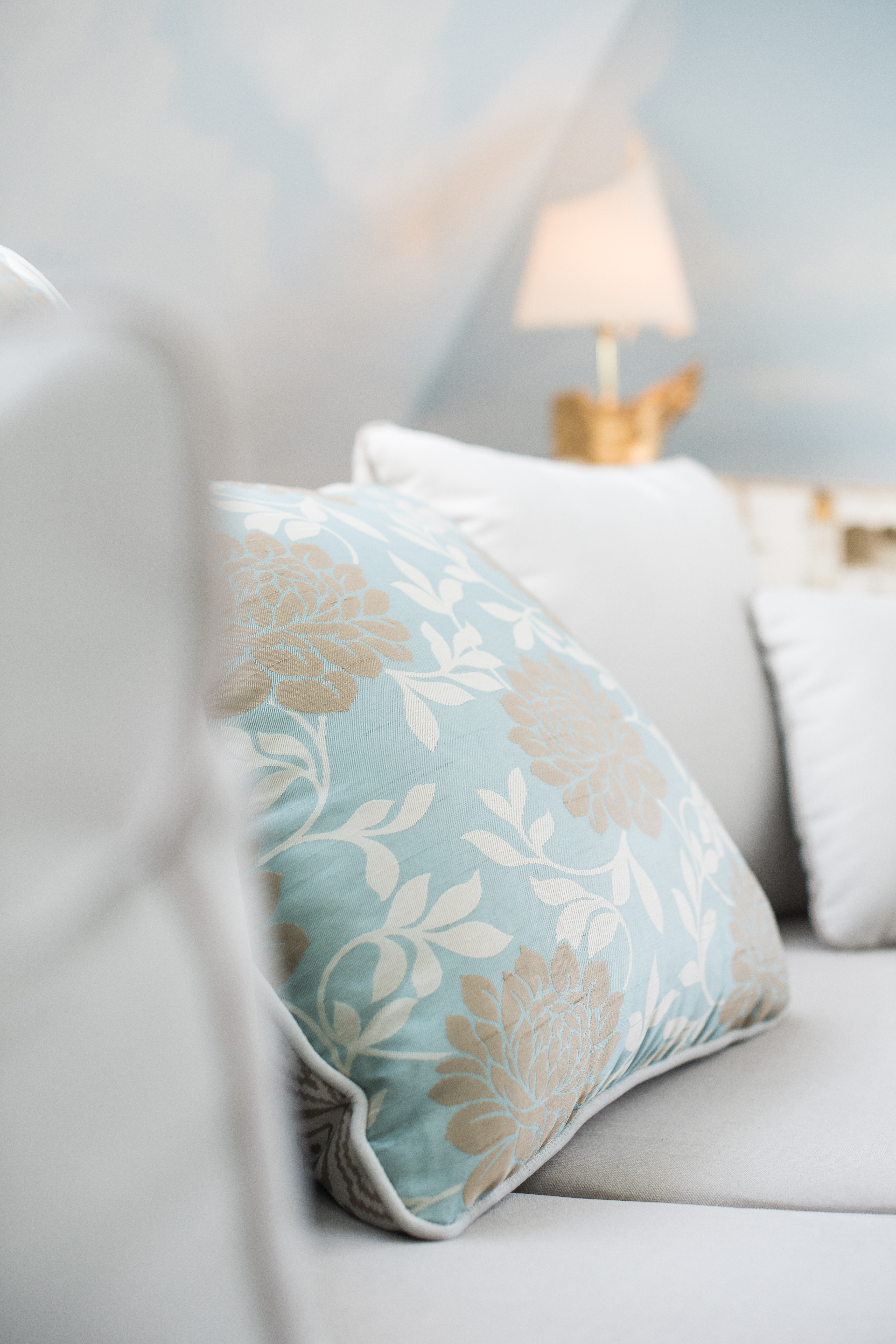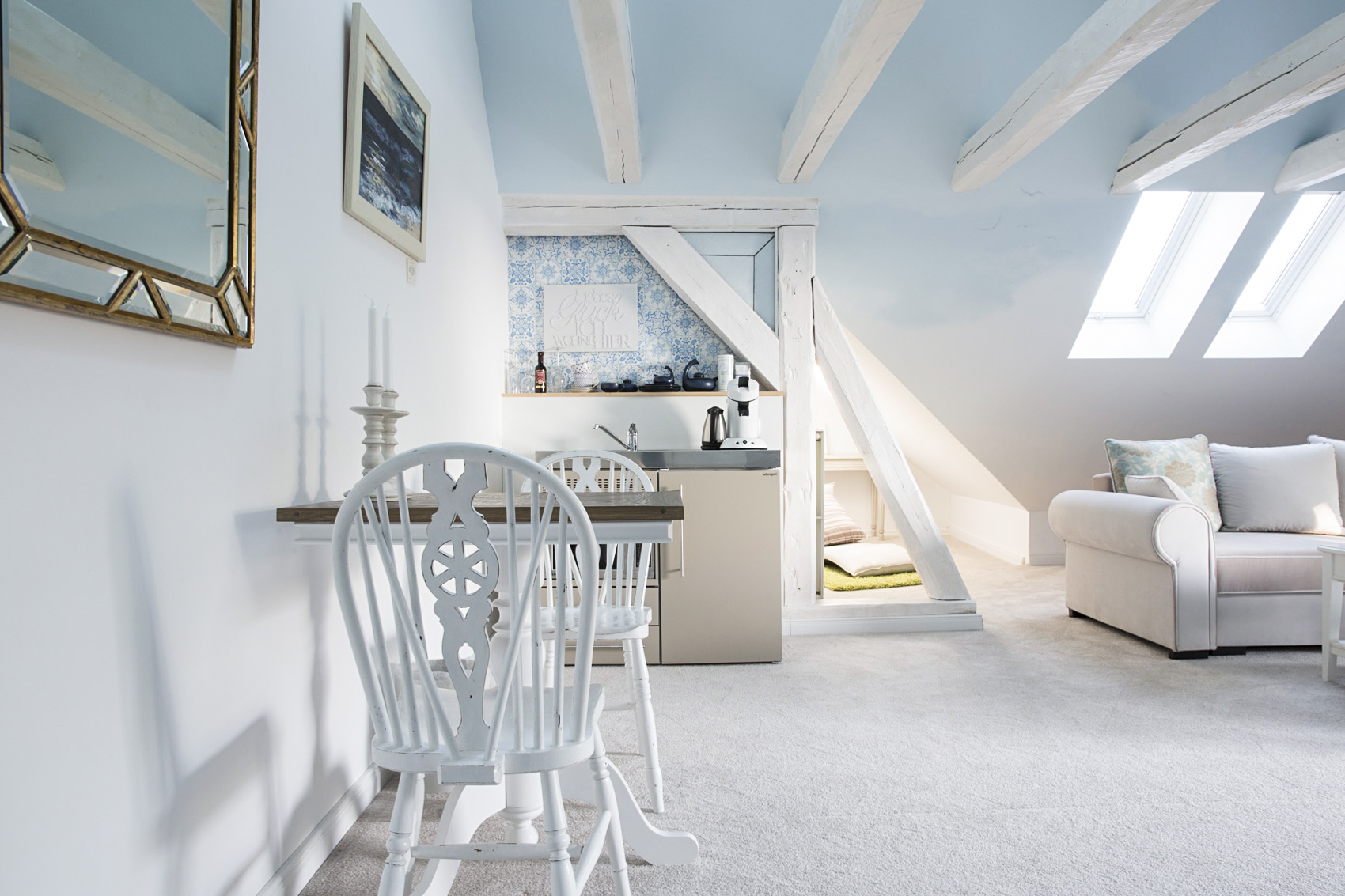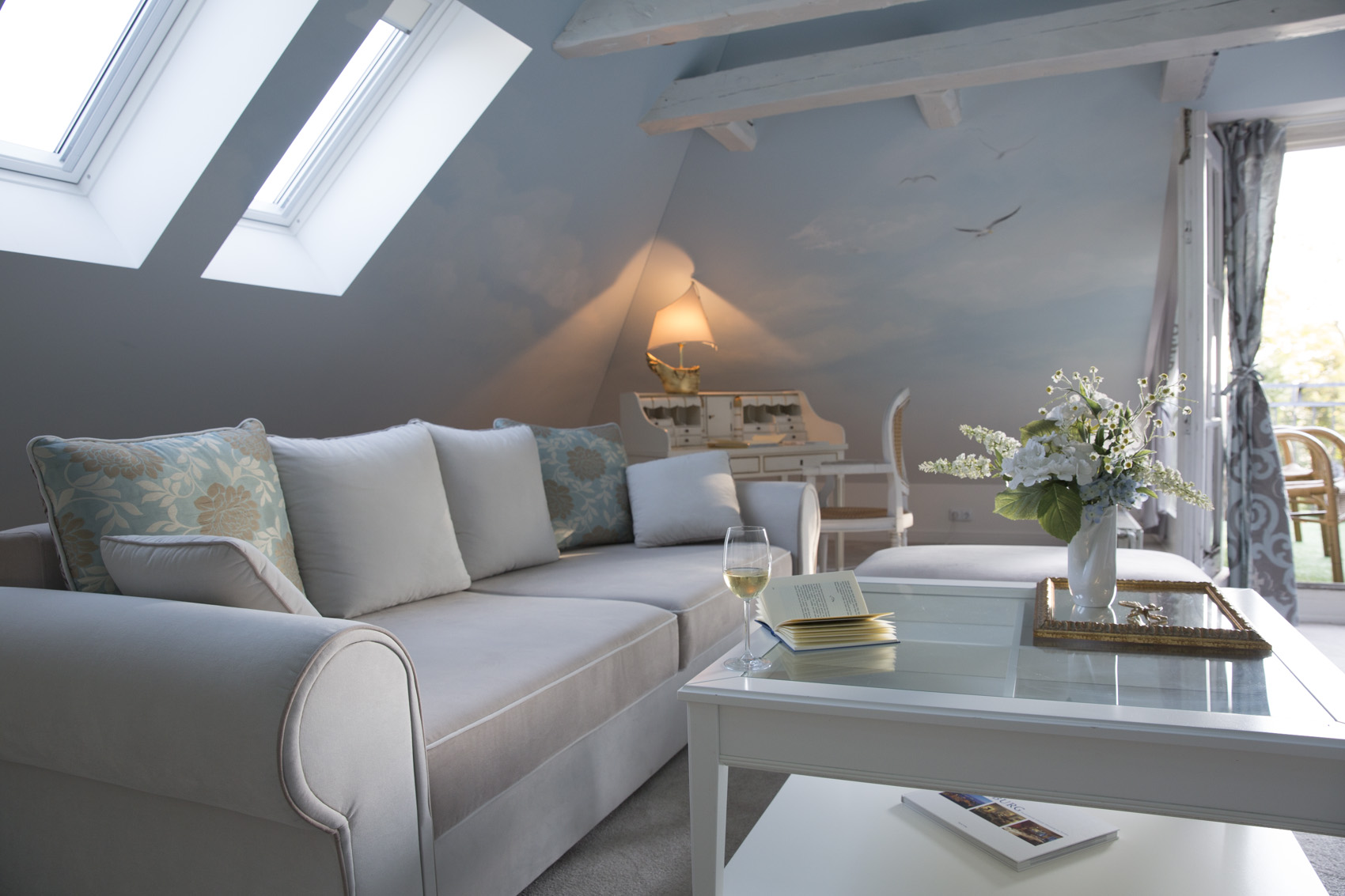 Dem Himmel im ganz positiven Sinne ganz, ganz nah. Nicht nur auf dem kleinen Balkon mit Blick in den Lübecker Himmel fühlt sich diese Suite einfach nur himmlisch an! Sie schlafen direkt unter zarten Zuckerwattewolken, von der Künstlerin Natalie Johnson mit viel Liebe für die Ewigkeit festgehalten.